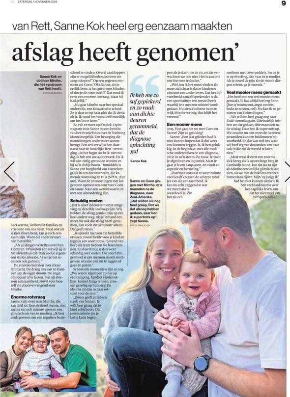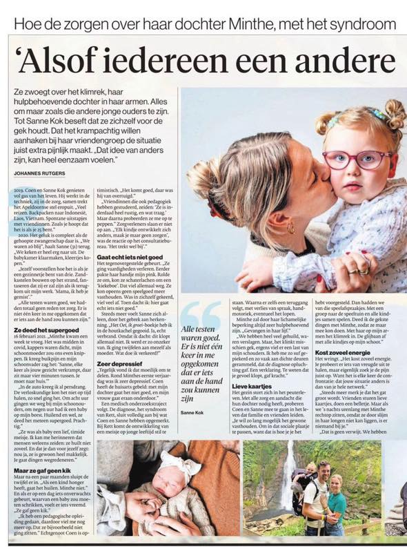 Sanne en Minthe stonden op 1 november op de voorpagina van De Stentor! Een groot artikel in deze krant over hun gezin naar aanleiding van de documentaire over eenzaamheid waar zij aan mee werkten.Sanne zou het mooi vinden als zichtbaarder wordt dat er kinderen zijn met een ander leven. “Dat het bijvoorbeeld vanzelfsprekender is dat een speeltuin een toestel heeft waarbij iets met een rolstoel wordt gedaan. Nu zien kinderen in onze wijk Minthe weinig, dus blijft het vreemd.”